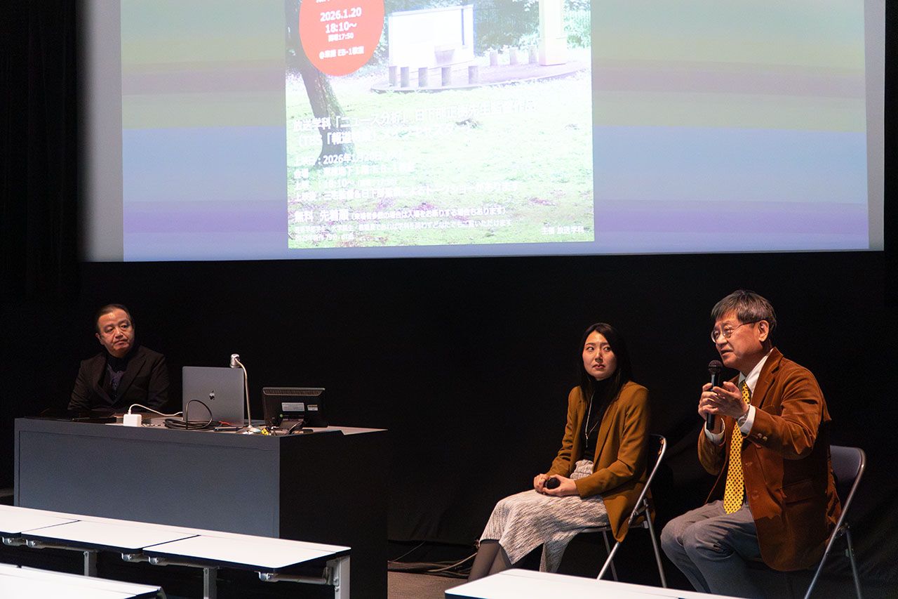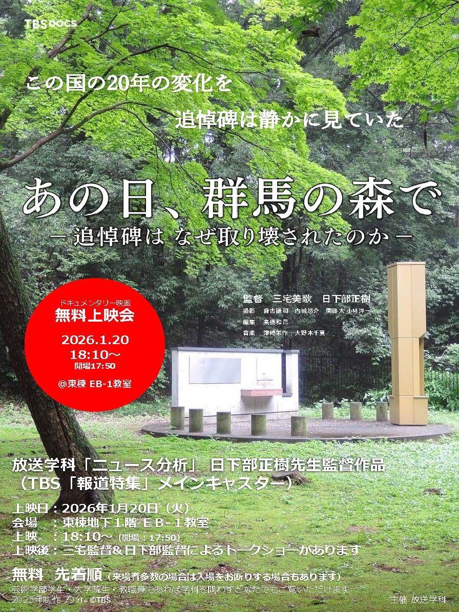 放送学科専門科目「ニュース分析Ⅲ・Ⅳ」担当の日下部正樹先生(TBS「報道特集」メインキャスター)監督によるドキュメンタリー映画『あの日、群馬の森で』の上映会が、2026年1月20日に東棟地下1階EB-1教室で開催されました。